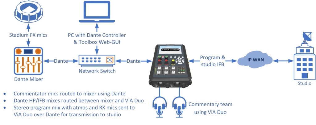 Use as an AoIP Commentary Unit The multipurpose ViA Duo includes optional support for RAVENNA, Dante, AES67, ST2110-30, Livewire and NMOS for use in broadcast commentary positions or for secondary or sideline commentary positions. |