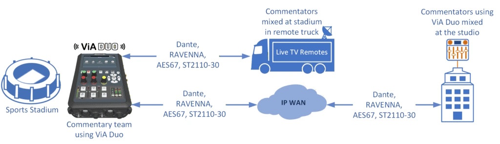 The ViA Duo can be used in a variety of broadcast commentary roles for radio and TV broadcasts. Optional support for AoIP protocols like RAVENNA, Dante, AES67, ST2110-30, Livewire and NMOS facilitates using ViA Duo as an AoIP node in stadium commentary booths or on the sideline. Flexible options include connecting over a LAN to a remote truck at a venue, or over a WAN with a REMI (Remote Integration) use case back to a mixing console at a studio hub.