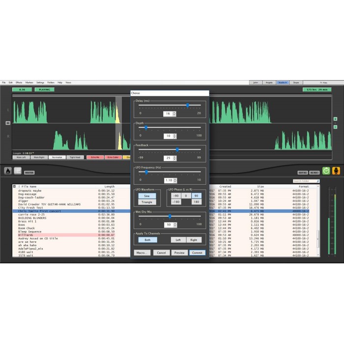FX Macros are available to create one-button macros for frequently used effects and other editing operations. FX Macros can be used to create a preset for any available effect that can then be assigned to an on-screen button for quick recall. FX Macros can trigger an action or a chain of actions. For example, one click could trigger a chain of actions, starting with the removal of silences from a call-in audio file (using GapBuster), then running the results through ClipCleaner, and finally normalizing both host and caller channel levels for final broadcast. In addition to a new FX Editor, Wheatstone designers also overhauled the VoxPro Effects menu, making special effects like chorus, reverb and distortion much more accessible and making recent effect settings “sticky” for automatic recall.